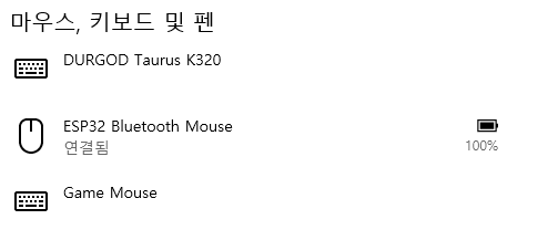 코드가 업로드되면 아래와 같이 "ESP32 Bluetooth Mouse"라는 이름으로 블루투스 장치가 검색된다. 연결하면 바로 마우스로 사용이 가능하다.
