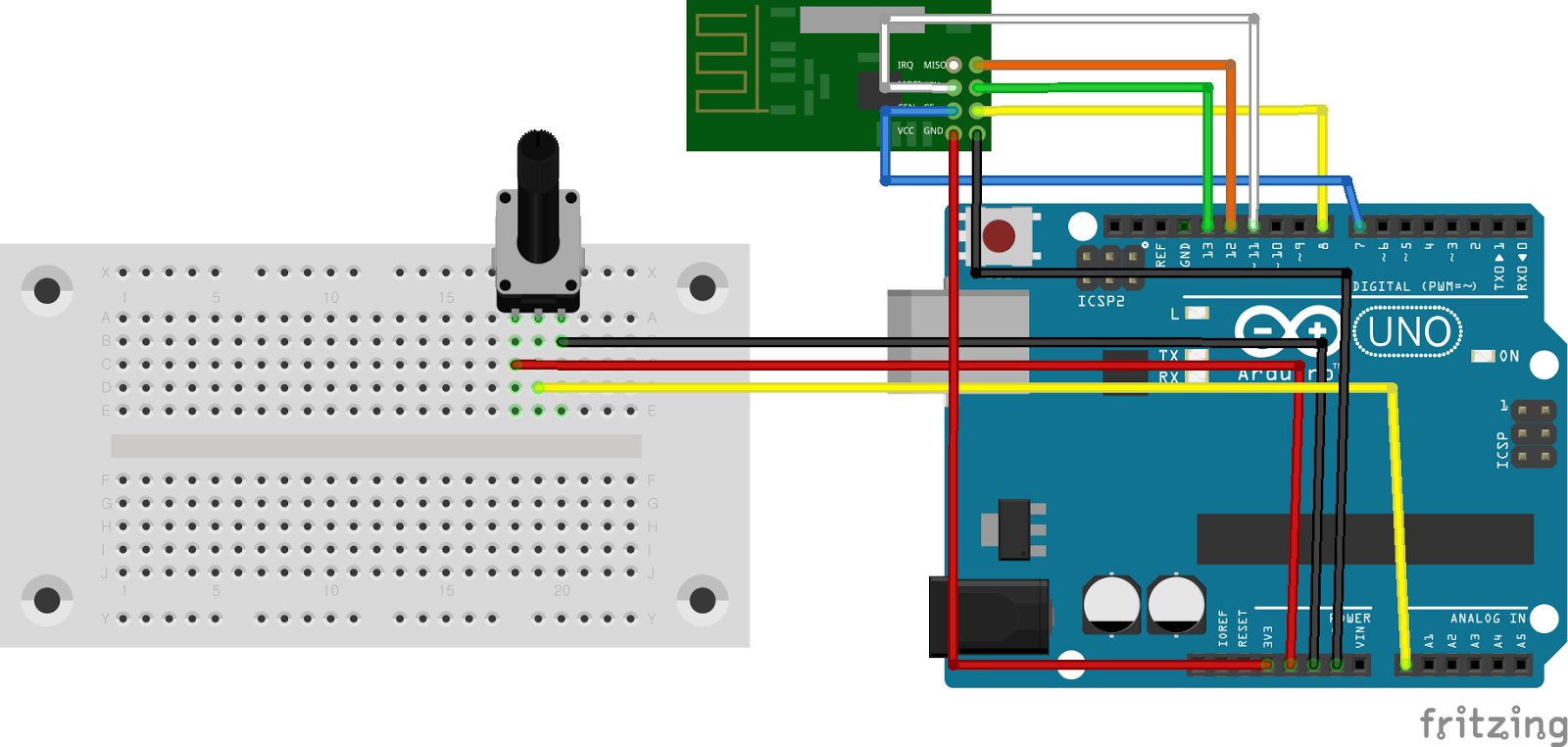 송신부에서는 가변저항의 값을 읽어들여 수신부로 보내는 역활을 합니다. NRF24L01모듈의 특성상 아두이노의 전원 노이즈와 전력량에 영향을 받기 때문에 NRF24L01의 VCC와 GND단자에 10uF의 콘덴서를 달아주는 것이 좋습니다.